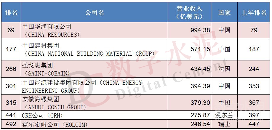 另外,來自法國、愛爾蘭、瑞士的國際水泥巨頭今年排名均有所下滑,霍爾希姆公司(HOLCIM)(原拉法基豪瑞)排名由去年的447位下滑至492,CRH公司排名由去年的397下滑至441位,圣戈班由去年的244位下滑至266位。