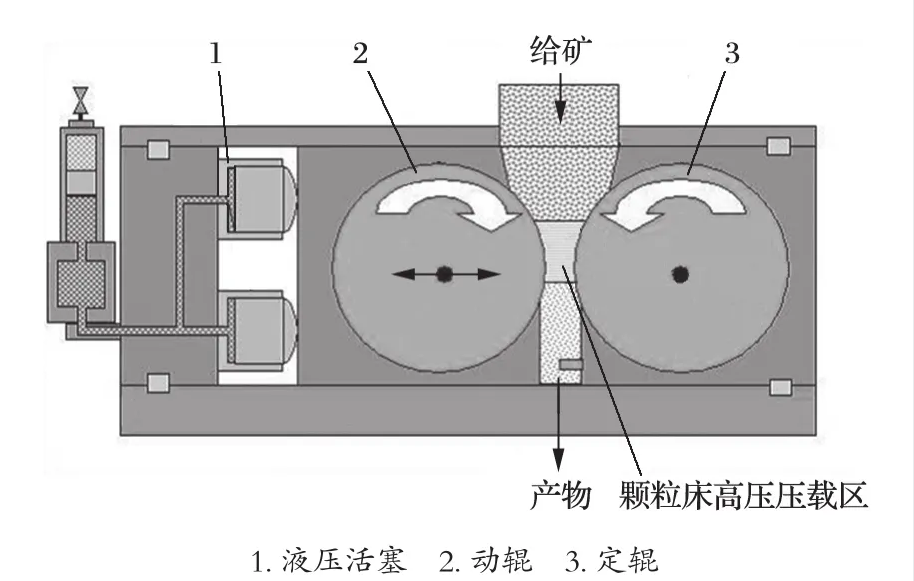 高壓輥磨機的工作原理為料層粉碎,工作時物料由進料口進入動輥與定輥之間的破碎腔,借助一對連續(xù)作業(yè)的高壓輥及物料自重,物料被強行擠入不斷壓縮的破碎腔中并被壓實,壓實擠滿的物料在巨大的壓力下被破碎,最終礦石物料形成緊實、布滿裂縫的料餅排出,高壓輥磨機層壓粉碎原理如圖1所示。