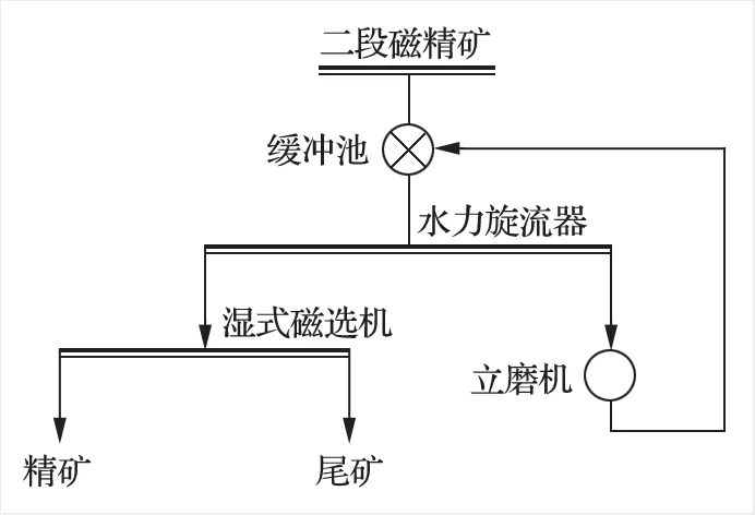 圖5所示為立磨分級-磁選工藝流程。二段磁選精礦進入旋流器預(yù)先分級,溢流進行磁選,而沉砂進入立磨機再磨,立磨機排礦再進入旋流器分級。該工藝流程細磨效率高、粒度指標好、粒級分布范圍窄,對精礦的“提質(zhì)降雜”有良好效果。