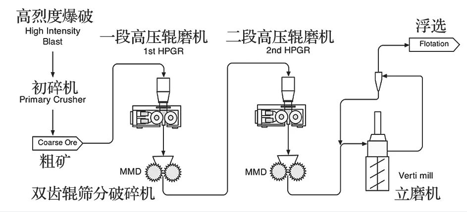 Valery和Jankovic于2002 年首次提出了將高壓輥磨機和立磨機組合成一個新型碎磨工藝流程的概念,如圖6所示,該工藝流程采用二段高壓輥磨破碎和立磨機細磨,從而替代傳統(tǒng)的破碎-球磨機工藝流程。仿真結(jié)果表明,該工藝流程降低了將近 45%的能耗,但并沒有進行試驗測試。為了進一步驗證高壓輥磨機與立磨機聯(lián)合碎磨工藝的可行性,Drozdiak等人針對某銅礦,在同等條件下,對比分析不同工藝流程的粉碎能耗、總工藝能耗、運行費用、項目投資等,有力地證明了新型高壓輥磨機-立磨機工藝流程較傳統(tǒng)的破碎-球磨機工藝流程和高壓輥磨機-球磨機工藝流程具有更大的優(yōu)勢。北京科技大學的王成鐵等人選取銅礦中的粗礦樣品,分別采用自磨/半自磨-球磨機、高壓輥磨機-球磨機、高壓輥磨機-立磨機進行磨礦試驗,并進行工藝流程建模和仿真,仿真試驗結(jié)果表明,高壓輥磨-球磨機工藝流程與高壓輥磨機-立磨機工藝流程都具有較高的能效,但高壓輥磨機-立磨機工藝流程具有更好的研磨細度。