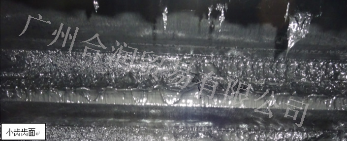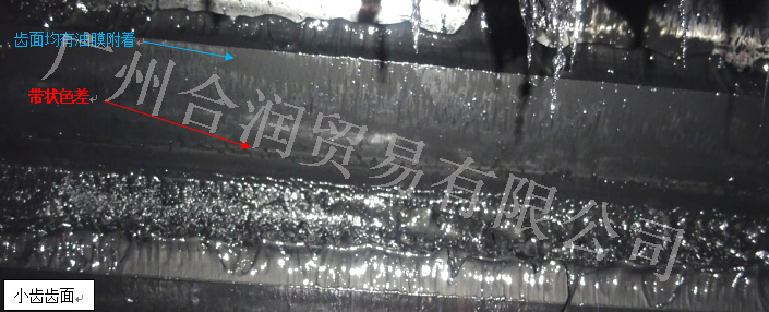 小齒齒面:使用頻閃儀觀察,齒面狀況良好,無明顯缺陷,齒根附近有條明顯的帶狀色差,建議停機檢修時擦干齒面觀察,如有明顯臺階則建議打磨。