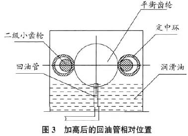 ( 1)改造潤滑系統(tǒng)。在第一次對(duì)設(shè)備失效原因分析時(shí), 只考慮到強(qiáng)制潤滑系統(tǒng)的缺陷, 是造成設(shè)備失油的主要原因, 忽略了飛濺潤滑的作用。經(jīng)測量發(fā)現(xiàn)減速機(jī)內(nèi)靜態(tài)油面, 僅與一級(jí)減速大齒輪底部齒頂平齊; 這是因?yàn)閺?qiáng)制潤滑系統(tǒng)的回油管高度低造成的。為使各齒輪和軸承得到更為充足的潤滑, 對(duì)潤滑系統(tǒng)進(jìn)行了改造。將減速機(jī)內(nèi)回油管加高, 使回油管高度高過一級(jí)減速大齒輪底部一個(gè)半齒, 以增加減速機(jī)內(nèi)部貯油量和油面高度, 充分發(fā)揮飛濺潤滑的作用,見圖3。
