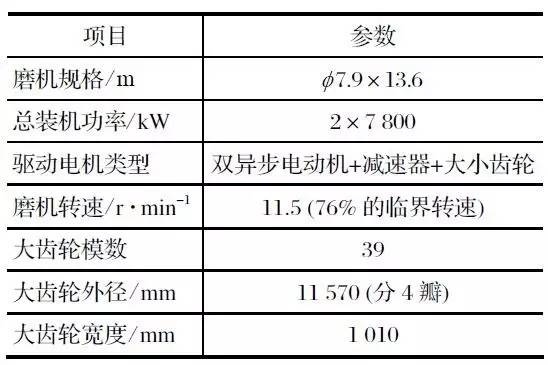 該項目中配置的 Φ7.9 m×13.6 m 溢流型球磨機采用的是雙驅(qū)齒輪驅(qū)動系統(tǒng),其主要參數(shù)如表 1 所列。