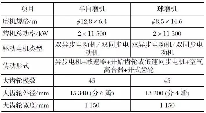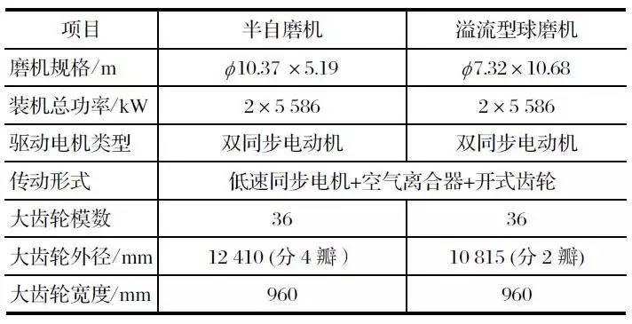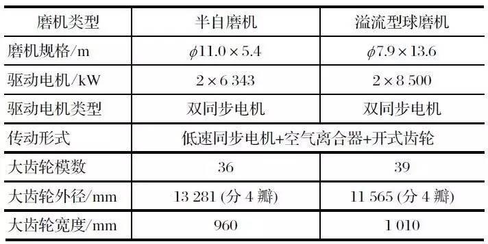 該項目是中信重工設(shè)計制造的雙驅(qū)溢流型球磨機和雙驅(qū)半自磨機,2010 年 12 月 2 臺磨機正式投產(chǎn),其傳動部分主要參數(shù)如表 2 所列。