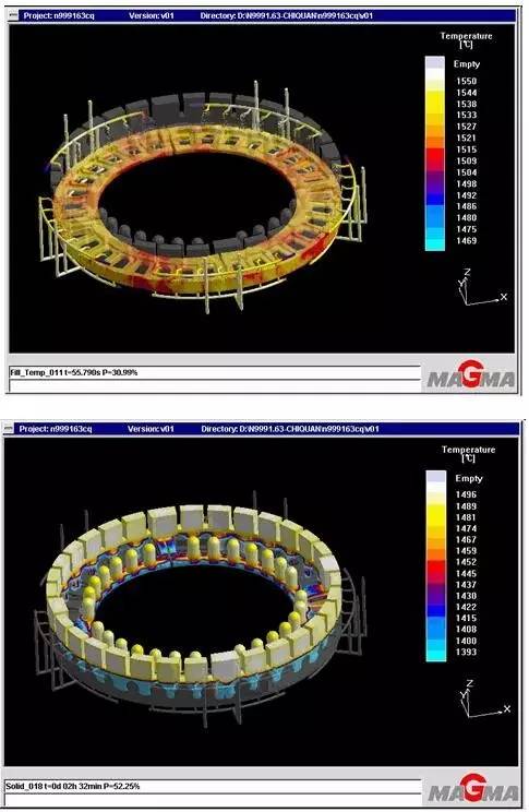 中信重工最先使用 MAGMA 軟件 (見圖 1) 進行大齒輪鑄件分析,主要目的是優(yōu)化澆鑄和凝固過程,減少鑄件的缺陷。澆注冒口采用環(huán)形冒口,利用此方法需要實際金屬澆注鋼水量是環(huán)形齒輪凈重的 2.5 倍。SINO 鐵礦球磨機大齒輪采用多鋼包澆注,該齒輪外徑為 11.7 m,凈質(zhì)量為 118 t,鋼水質(zhì)量為 375 t。整個環(huán)形齒輪整件澆注,即使被分成 4 等分或更多,該澆注方式也能保證整個齒輪擁有相同的化學(xué)性能,并在熱處理時提供均勻的硬度。中信重工一次可提供最大鋼水質(zhì)量為 900 t,能夠制造齒輪最終鑄件凈質(zhì)量達 250 t。中信重工已投入使用 Φ22 m 重型立車,最大車削直徑可達 Φ22 m,最大加工工件高度為 8 m,最大工件質(zhì)量可達 500 t,為大型齒輪的制造提供了有力保障。