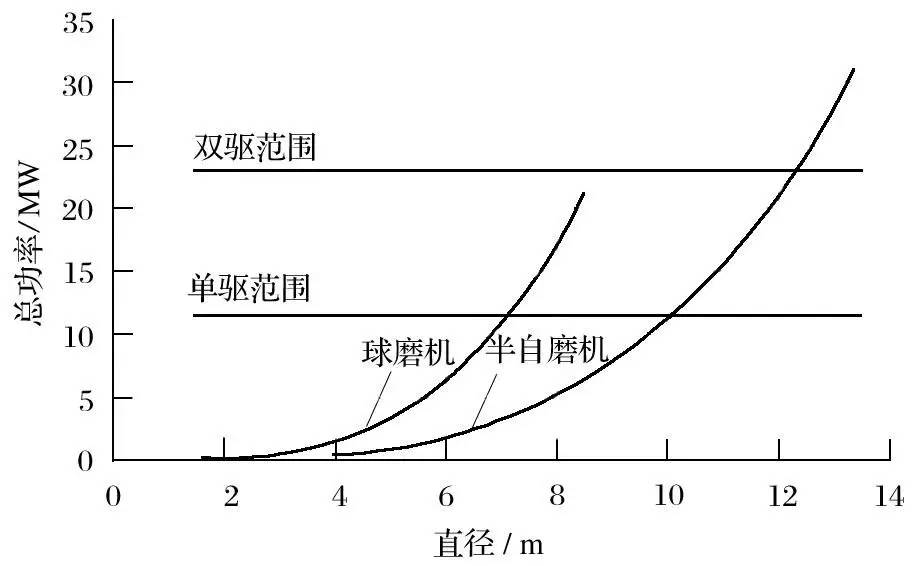 圖7 半自磨機大齒輪直徑和裝機功率