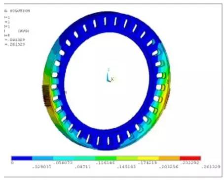 在大齒輪結(jié)構(gòu)設(shè)計中,利用有限元分析來校核輪緣結(jié)構(gòu)的合理性,評估大小齒輪的撓曲度。如圖 11~12 所示,中信重工磨機的大小齒輪均需進行有限元分析和修正。有限元分析過程中,載荷考慮磨機的實際運行過程中筒體的支撐作用,根據(jù)有限元分析結(jié)果確定大齒輪的合理結(jié)構(gòu),根據(jù)大小齒輪接觸應(yīng)力的大小對小齒輪進行有針對性的修形,如圖 11 所示。