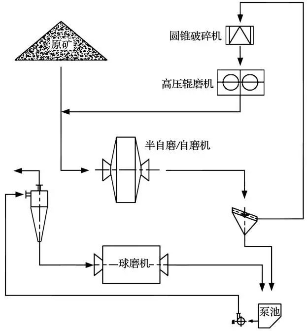 高壓輥磨機(jī)邊料返回破碎工藝是指高壓輥磨中間產(chǎn)品直接進(jìn)入下道作業(yè)工序,邊料再返回高壓輥磨機(jī)再次破碎的工藝。輥壓后中間產(chǎn)品可以直接進(jìn)入球磨機(jī)磨礦,也可以先進(jìn)行分級,粗粒產(chǎn)品進(jìn)入球磨機(jī)磨礦。此工藝在輥壓產(chǎn)品細(xì)粉含量較高時(shí)優(yōu)勢明顯。