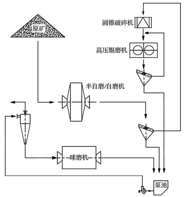高壓輥磨機(jī)干式篩分需要配置打散機(jī),對輥壓機(jī)料餅進(jìn)行打散,否則篩分效率會大大降低。此外,由于整個(gè)流程采用干式磨礦、干式篩分和干式選別,因此對物料水分含量要求較高,不宜處理含水量較高的物料,同時(shí)還要注意防塵工作,需配備除塵設(shè)備等。該流程主要應(yīng)用于非金屬礦和含泥少的礦石,以及缺水、干旱地區(qū)。