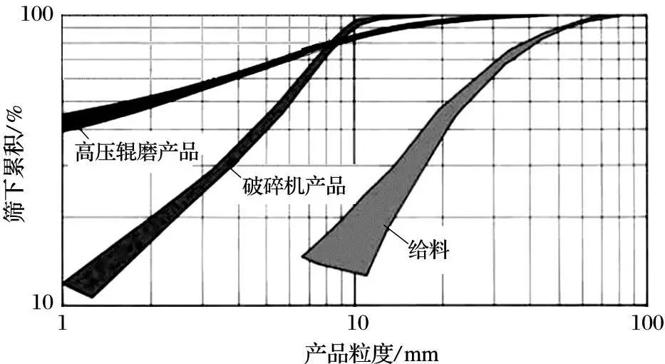 圖3 高壓輥磨機(jī)與圓錐破碎機(jī)產(chǎn)品粒度分布對比